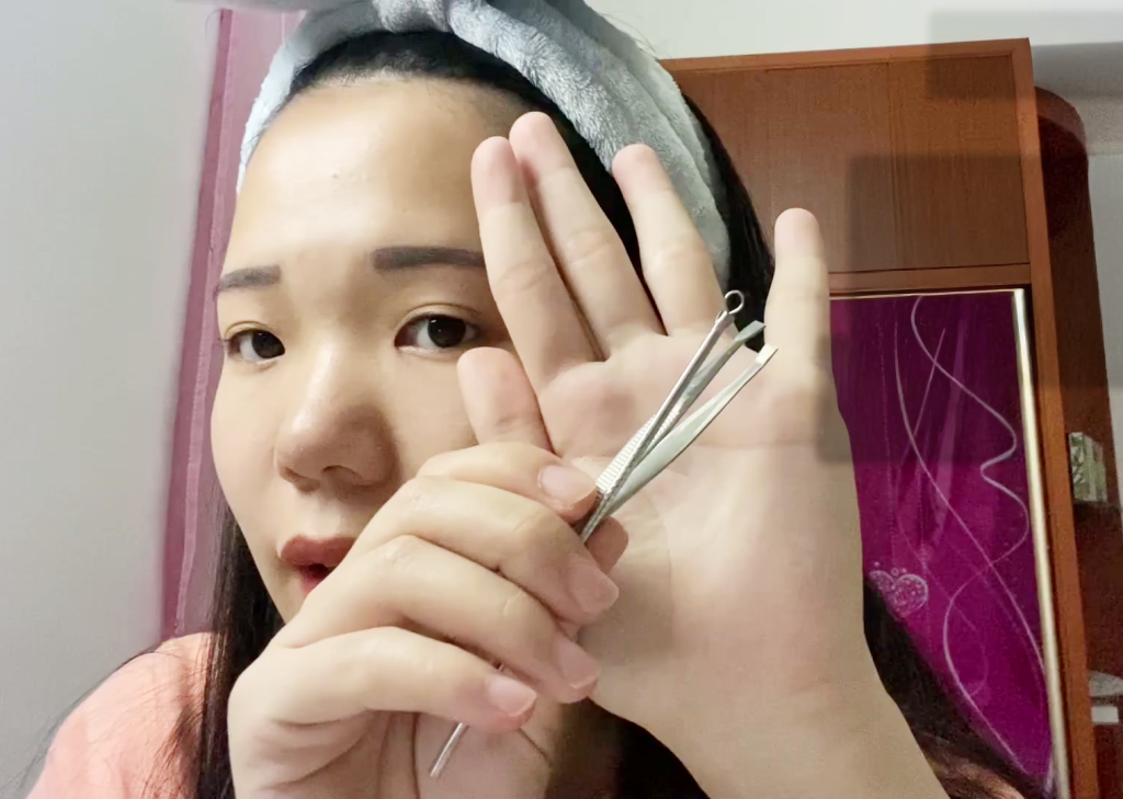 工具准备:暗疮针(选择圆头款,避免尖头划伤)、细胞夹(镊尖间距0.5mm以内,避免夹伤周围皮肤)、酒精棉片(75%浓度,消毒工具2次,每次15秒)。