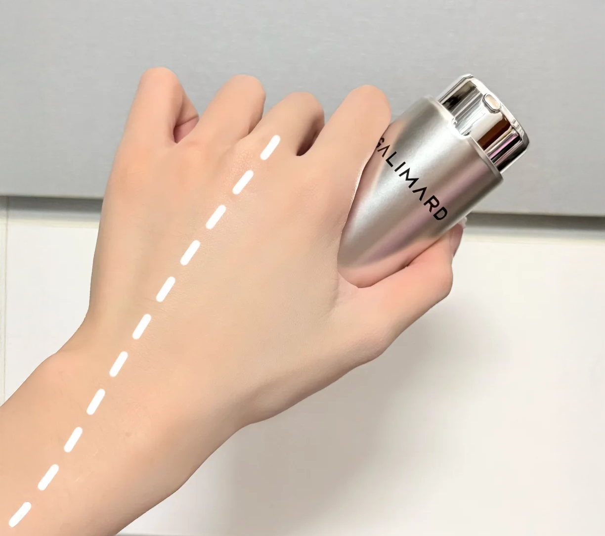 磨砂玻璃瓶身搭配按压泵头,控量精准且卫生。挤出后呈奶白色乳液质地,流动性中等,推开时能感受到明显的水润感,不像传统粉底液那样干涩。