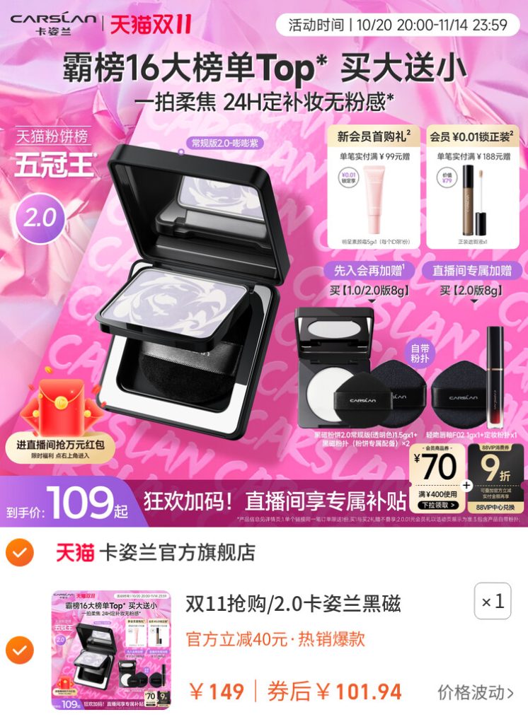 打开卡姿兰天猫旗舰店,黑磁散粉的促销页面标注着“双十一狂欢价149元,立减40元,会员再享专属礼”。但真正的优惠远不止于此,经过3小时的规则梳理,我发现这套组合拳确实诚意满满: